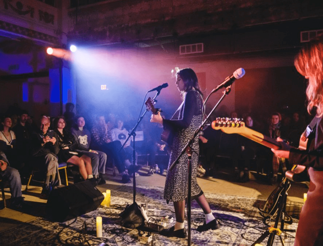 The Murmrr Theater seats about 700, but Sarah Beth Tomberlin (known by the mononym Tomberlin) and her band stand in the middle of the pit, and only about 150 of us encircle her in folding chairs.