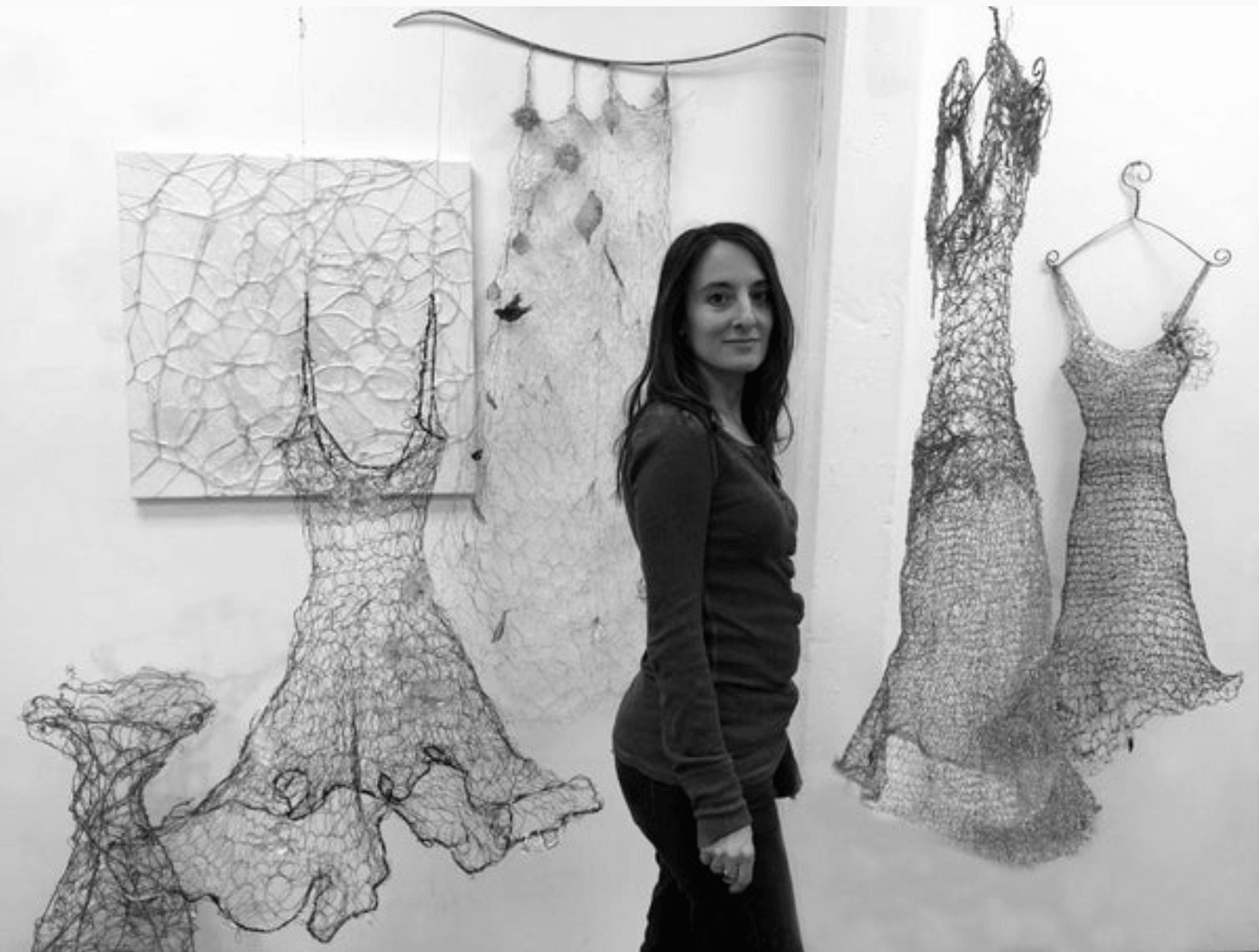 Eclectic and usually in the form of a dress, Susan Freda explores all types of media and how they can transform into beautiful works. Freda explores media like painting, metal, glass, crochet, knitting, and jewelry to create sculptures in the form of dresses, which are stationary and not wearable.