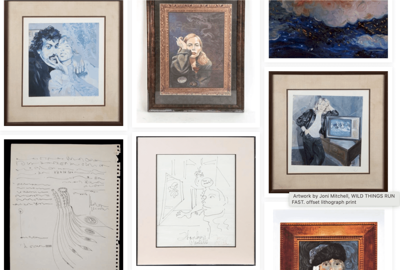 At the largest scale, Mitchell’s paintings circulate at the world’s most prestigious auction houses, and are also available to browse online. among auctions and are available to browse online. Almost all of her album artwork, was painted by Mitchell, herself.
