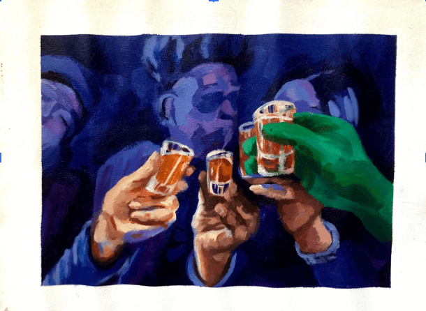 Girls night, 12×16, Oil and Pen on canvas, 2021