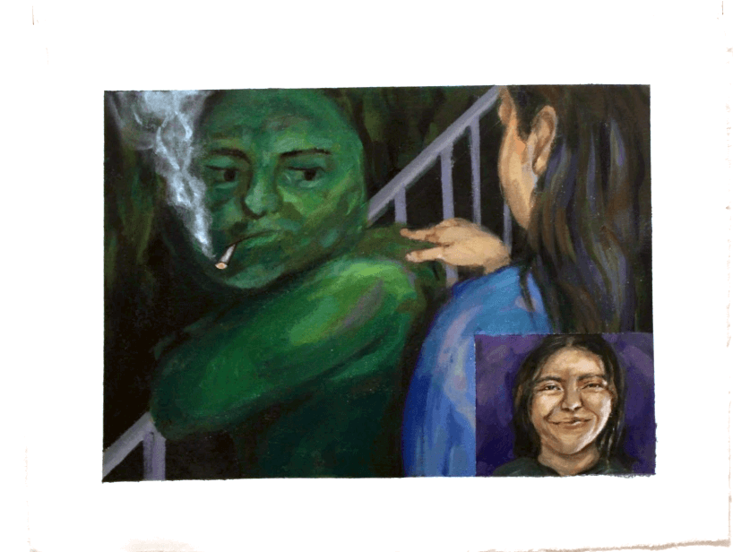 Lauren was my first girlfriend and first ex, but we were friends for years and she took that photo in high school. I’ve had a drawing of it, a fun little tongue in cheek drawing on in my room for so long and then this was also an assignment tied into a self-portrait and someone else. I was thinking about her all the time. I was missing my friends and I missed having a whimsical time with her. The reference I used for this was so goofy.