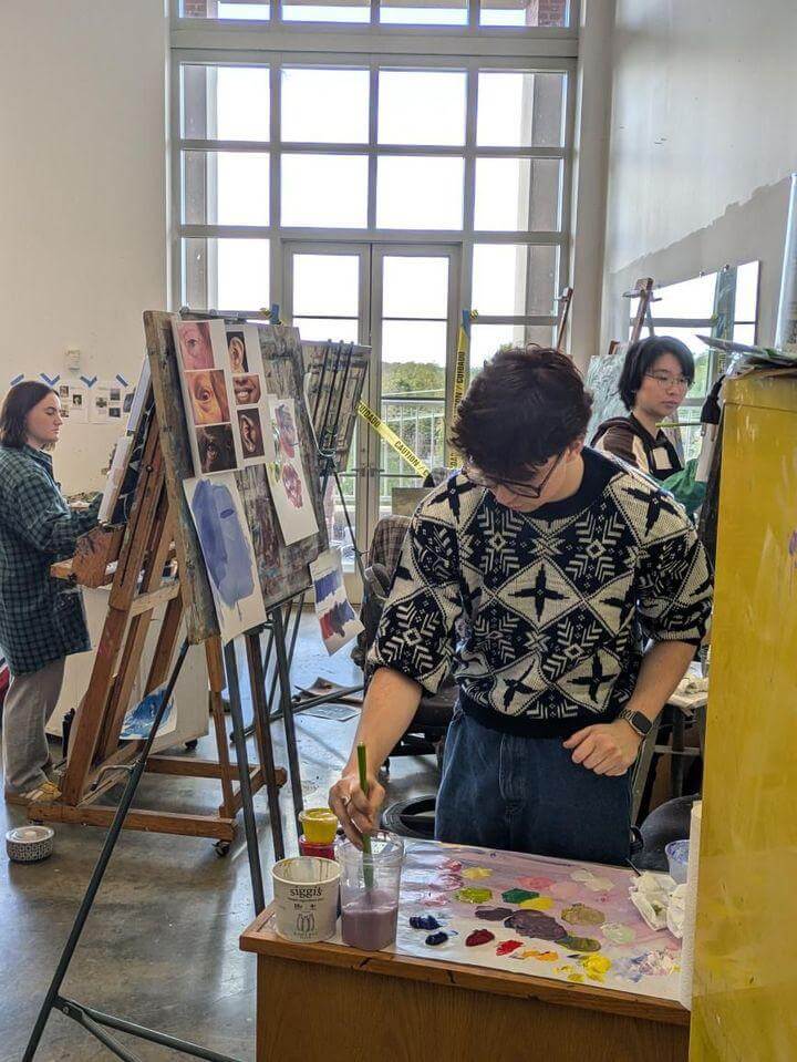 At home, I feel like I have a little bit more room to fool around, room to test and play and be a little more experimental. It’s a more permanent area. I have the tarps and everything in my room, so I’m not afraid to get messy. But when I’m here, at Davidson, I’m a little bit more concerned with the footprint I’m leaving with my art, like staining the floor or leaving paint in the sink. When I’m at Davidson, my speed at which I create art slows down and it sort of takes a backseat to learning. I like to relate it to a race or something. I’m racing, racing, racing, and then I need my recovery period, where I relearn and whatnot. I’m not making a ton of work right now, but I switch back and forth. The work that I produce here is also a lot more academically informed.
