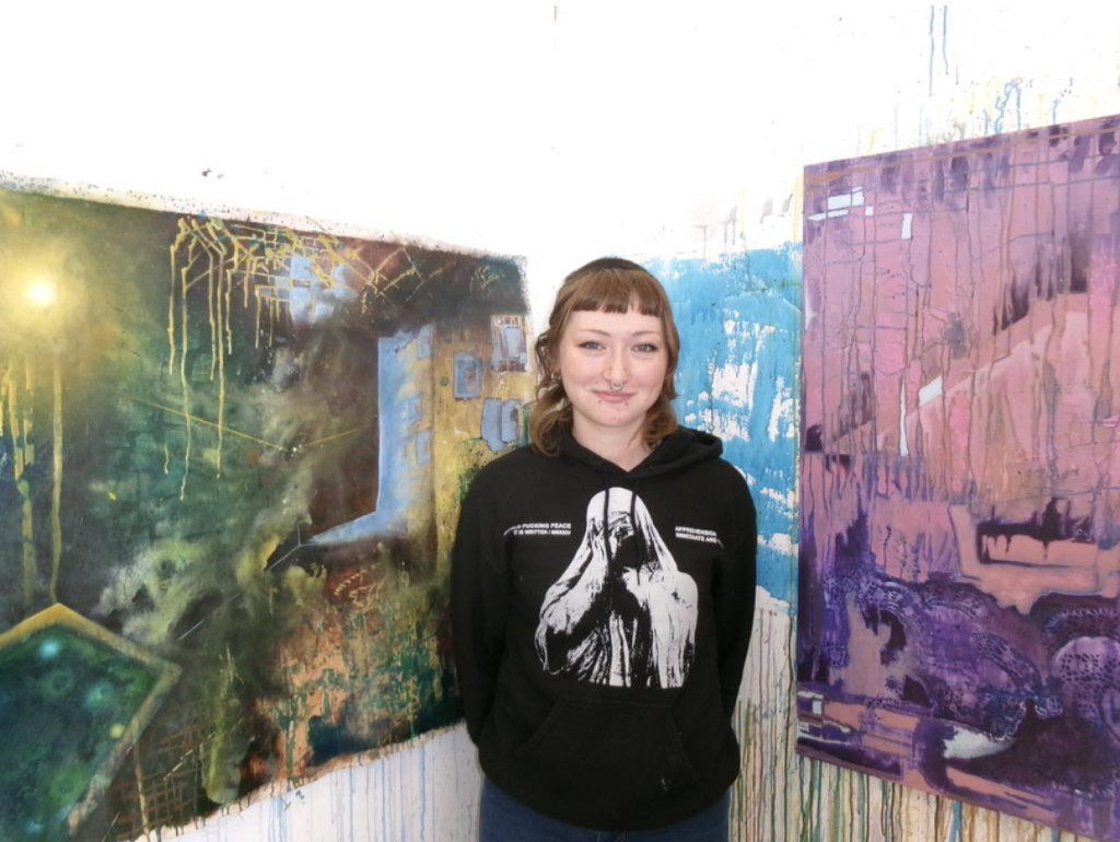 It’s not surprising that Mayer, 22, gravitated towards something less rigid than physics. When I ask her how she starts a piece, she explains that most of her work begins by layering on acrylic paint to cover the “too white” canvas. Layering and texture are huge parts of Mayer’s art style; she’s the only person I’ve ever heard get excited about watching paint dry.