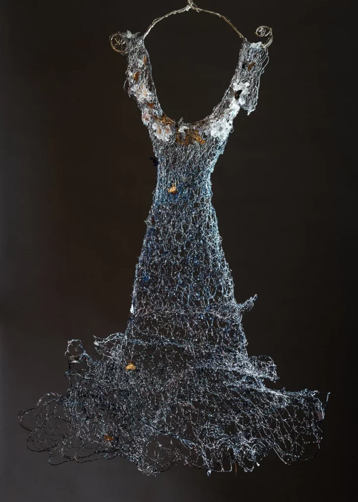 Eclectic and usually in the form of a dress, Susan Freda explores all types of media and how they can transform into beautiful works. Freda explores media like painting, metal, glass, crochet, knitting, and jewelry to create sculptures in the form of dresses, which are stationary and not wearable. Whimsical, delicate, and demure, these dresses showcase how different media can work together to make something stunning.