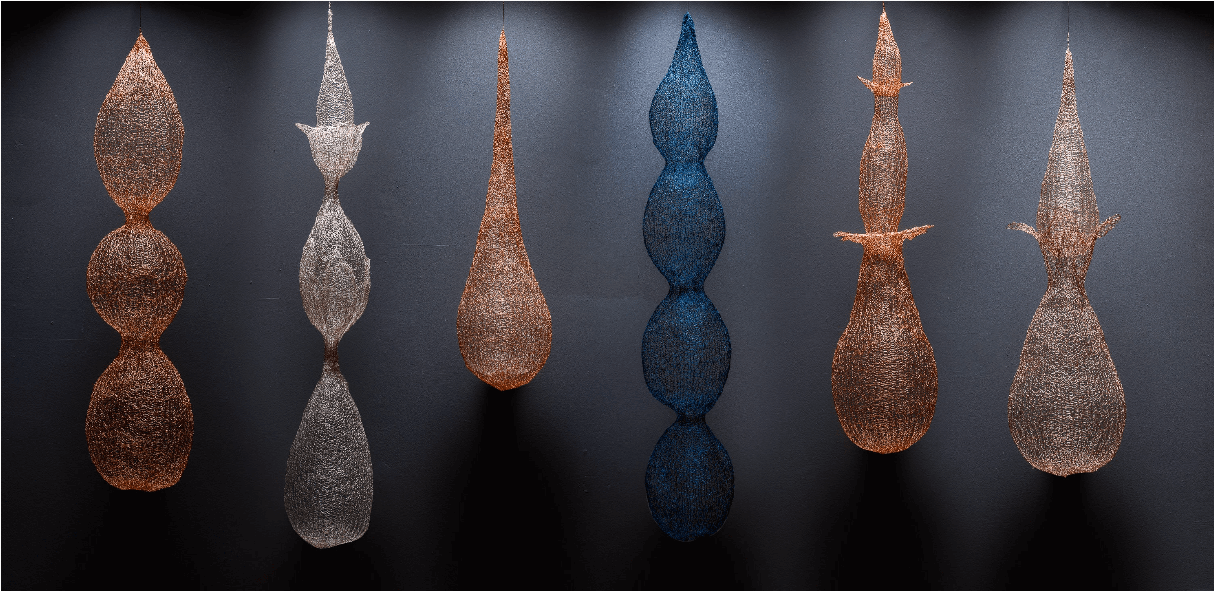 I make sculpture and jewelry most often. I’m most known for my wire dresses that hang on the wall (not to be worn, though I have made some for the runway in NY Fashion week years ago!) I have also made things like sculptural shoes for Stuart Weitzman and Ferragamo. My work is often made from wire that I weave by hand, similar to crochet. I use glass and other things that are natural looking: shells, flowers, and handmade objects to accent the wire. I love including nature into my work as much as I can. I make ephemeral work that is very transparent and delicate looking but is actually really pretty durable.
